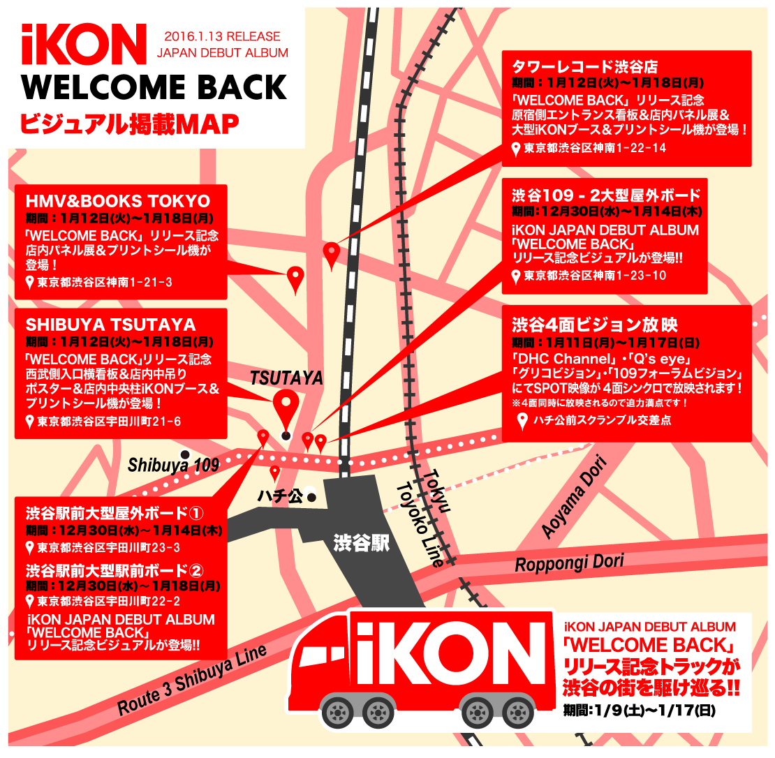 - 渋谷周辺にiKON大型ボードの掲載や大型ビジョンでのシンクロ放映、iKONトラックが走行します!